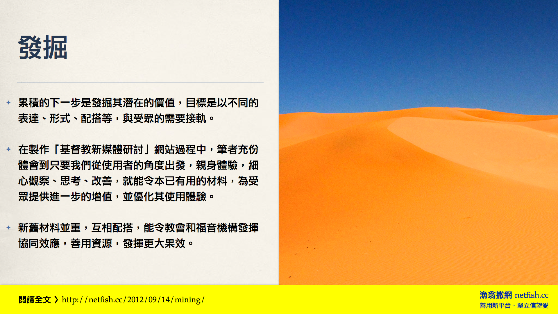 • 筆者以累積材料建立「基督教新媒體研討」網站的經驗,與讀者共同思考教會、福音機構及基督徒累積福音及牧養材料的意義及善用這些材料的方法,以產生協同效應,發揮更大的果效。