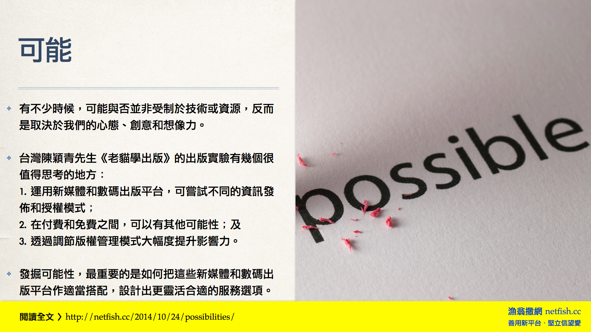 - 台灣陳穎青先生《老貓學出版》的出版實驗有幾個很值得思考的地方:
