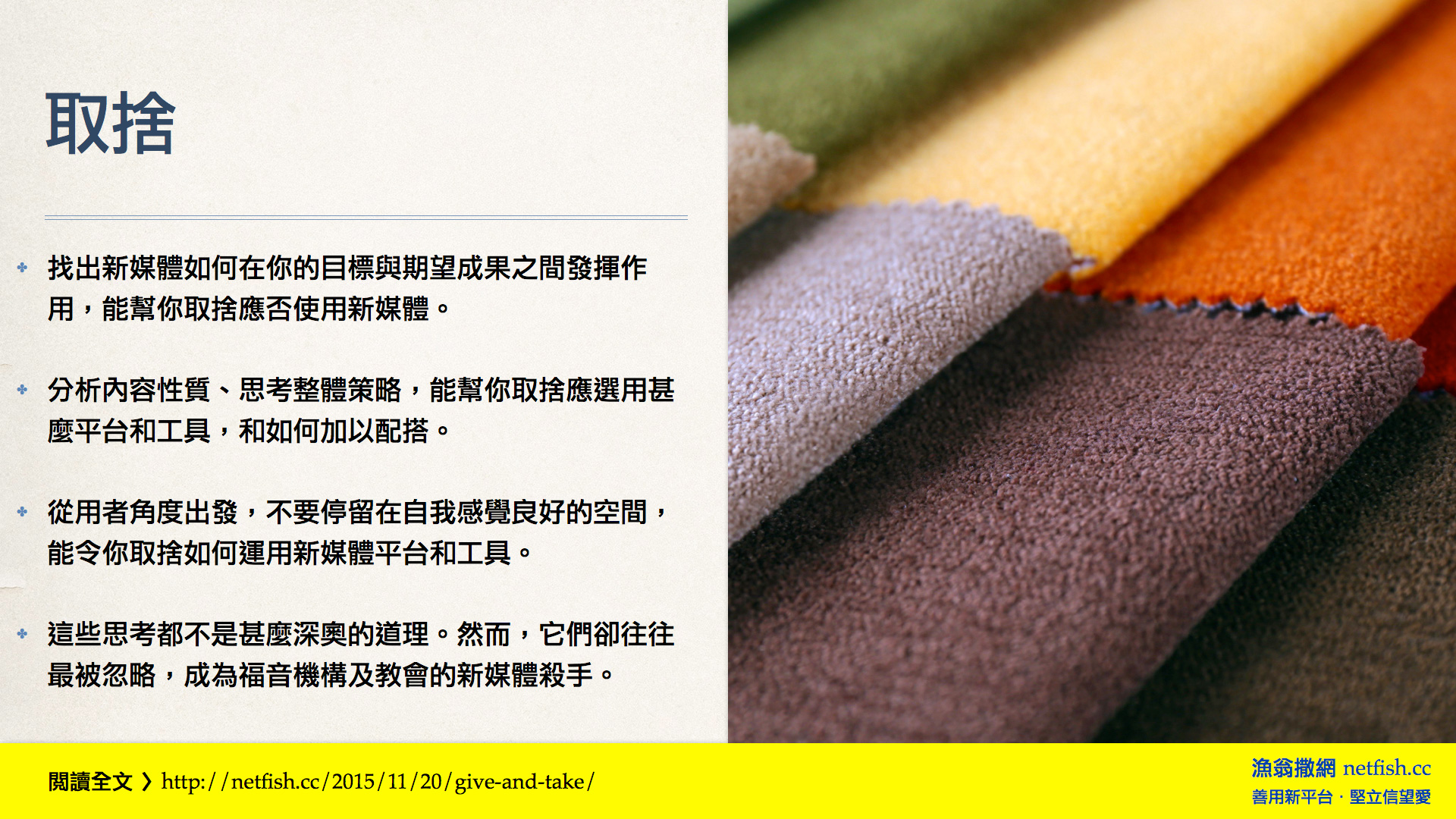 - 從用者角度出發,不要停留在自我感覺良好的空間,能令你取捨如何運用新媒體平台和工具。