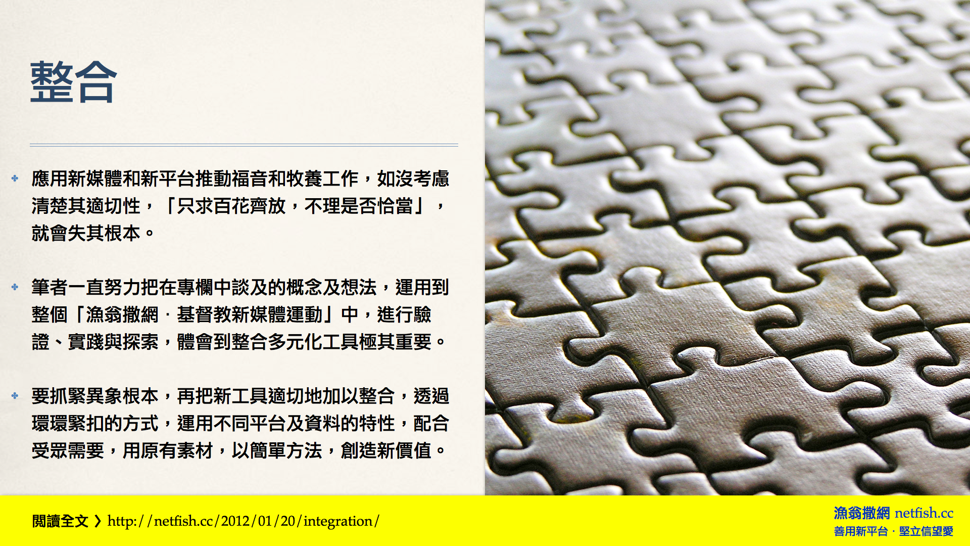 • 筆者一直努力把在專欄中談及的概念及想法,運用到整個「漁翁撒網.基督教新媒體運動」中,進行驗證、實踐與探索,體會到整合多元化工具極其重要。