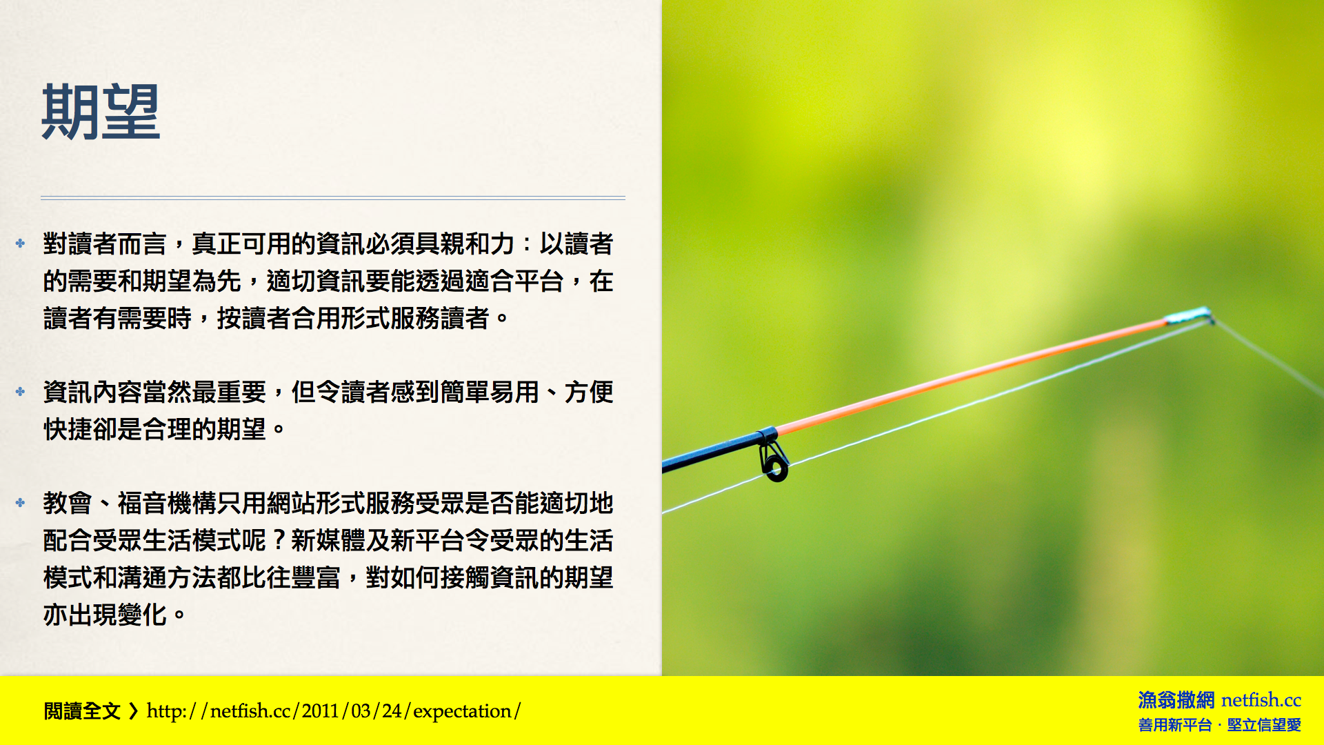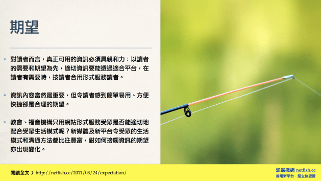 - 活用衍生原則:核心貫徹一致、定位清晰適切、彰顯獨特個性,可讓福音與牧養材料發揮不一樣的果效。