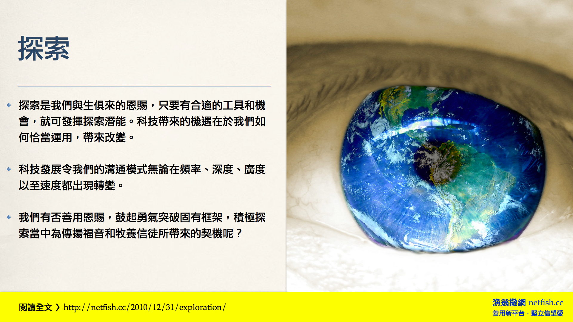 • 萬維網從連結到連繫,讓我們深化與延伸福音與牧養資訊的傳播,亦提供作見證的新平台。可在應用層面加以探索,作出小改變就能帶來大改善。
